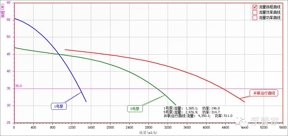 下面我们可以看看当两台参数相差比较大的两台泵的并联: